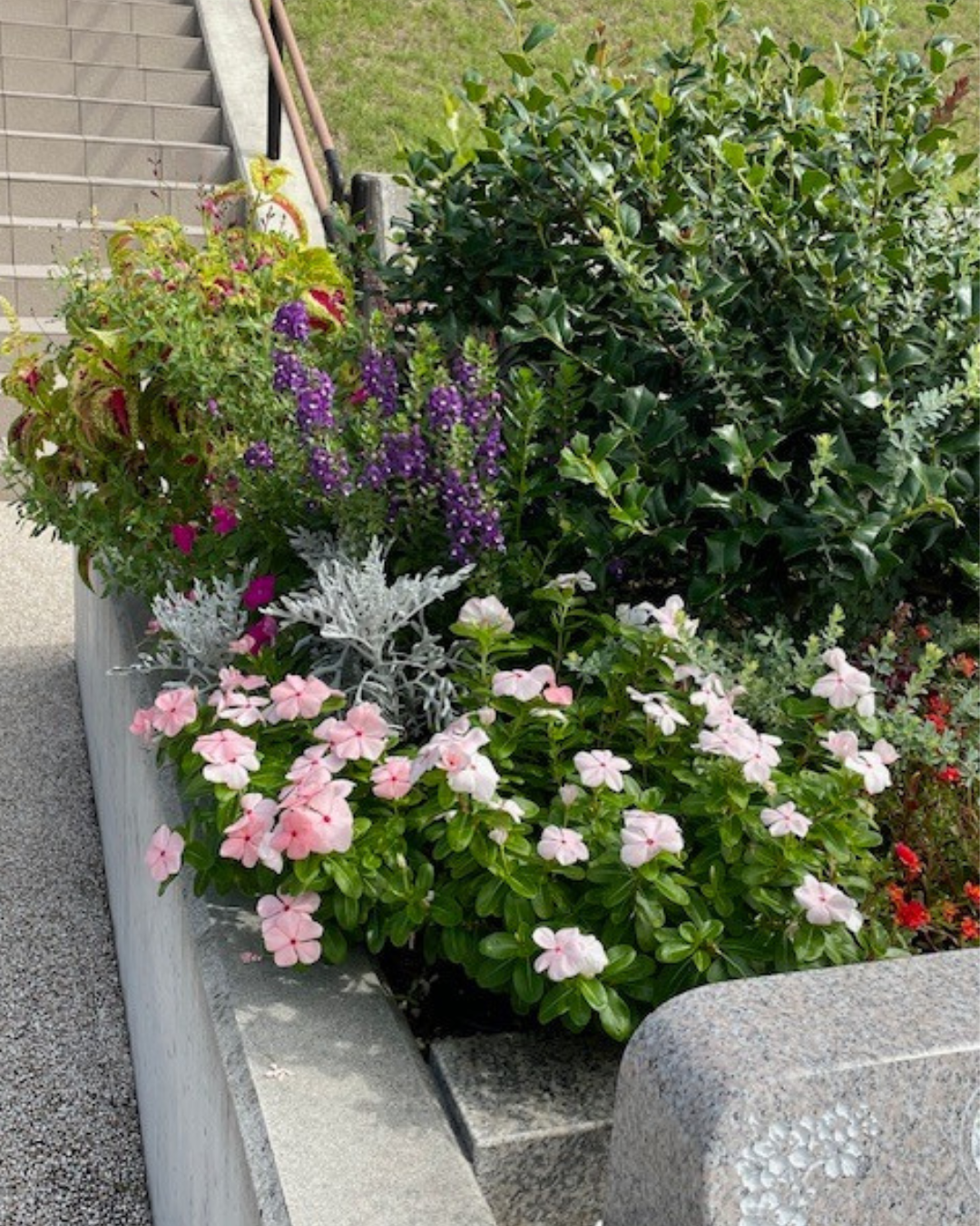 お彼岸前にお花のメンテナンス、それから墓所の周りの草刈りを行っていただきました。