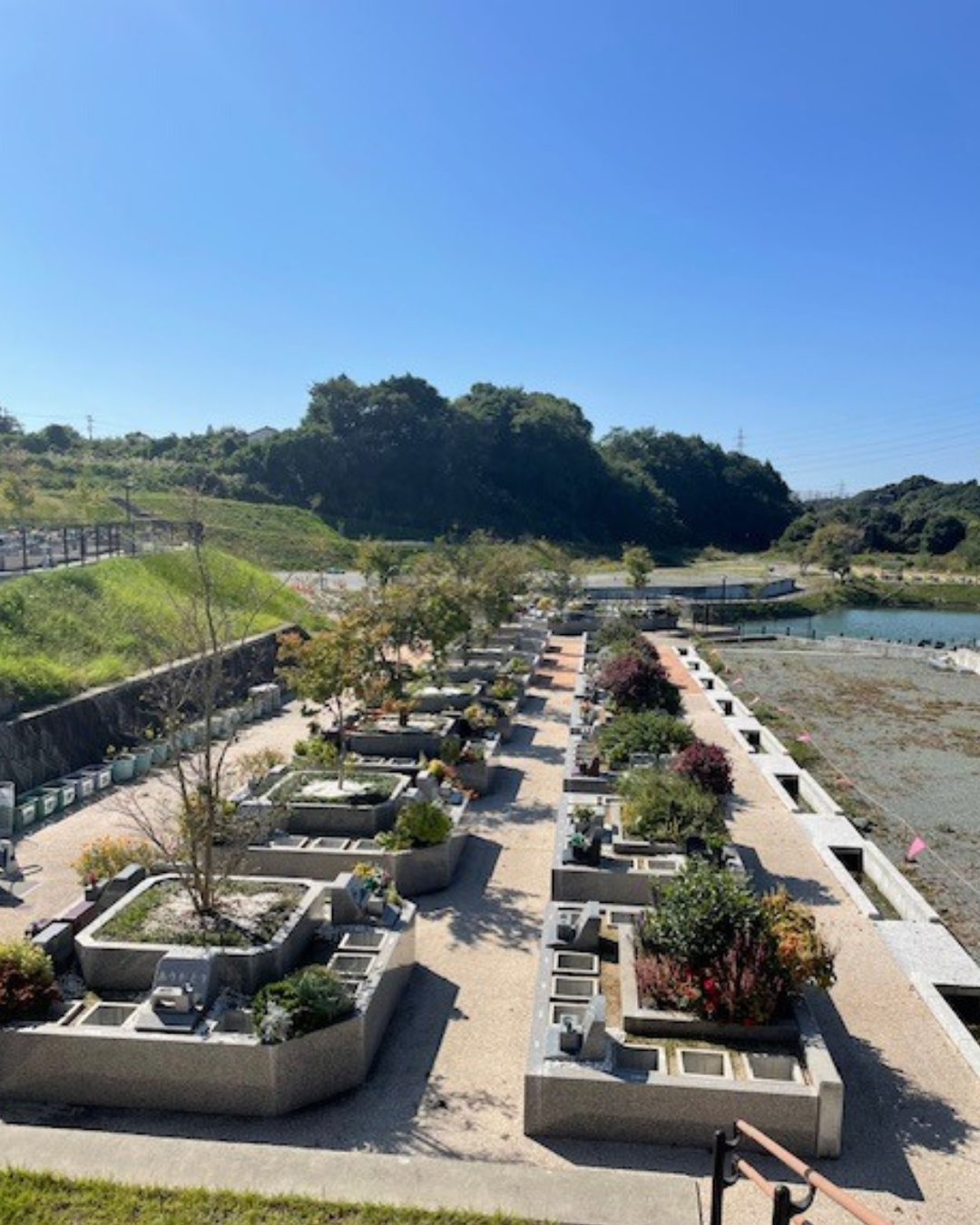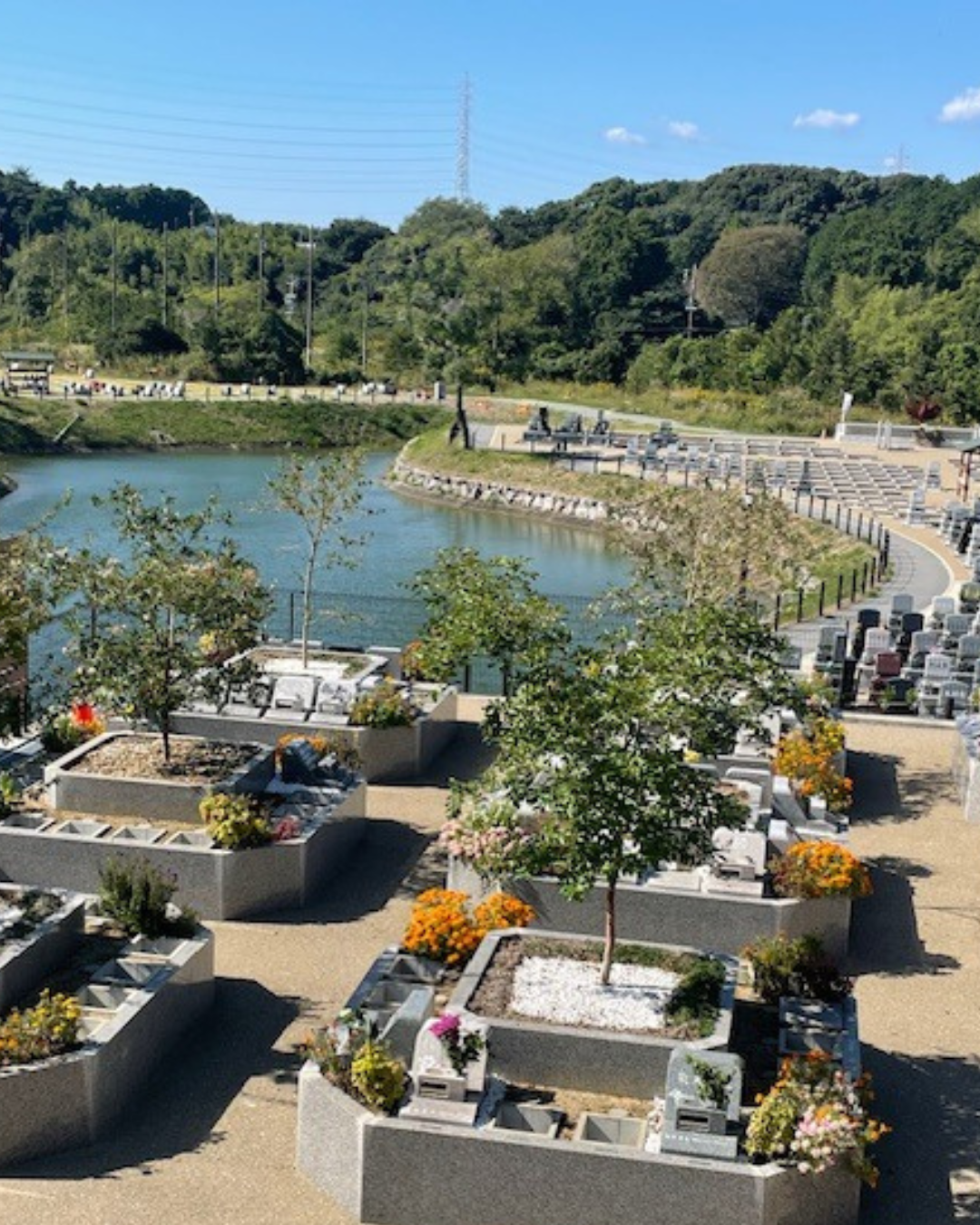 花壇墓所Aから見える「ビオトープ池」が澄んで見えます。