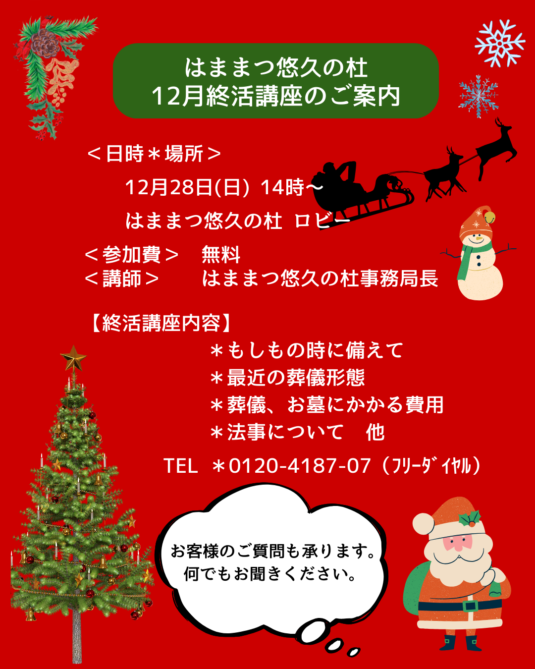 12月の終活講座は、年末休業日前日の、最終日に行います。